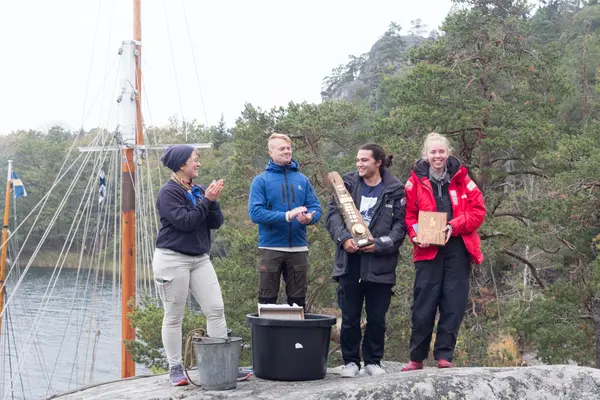 Kiki Beije, från tävlingsledningen i Saltkråkan Race, delar ut priserna till skepparna på vinnarna.
