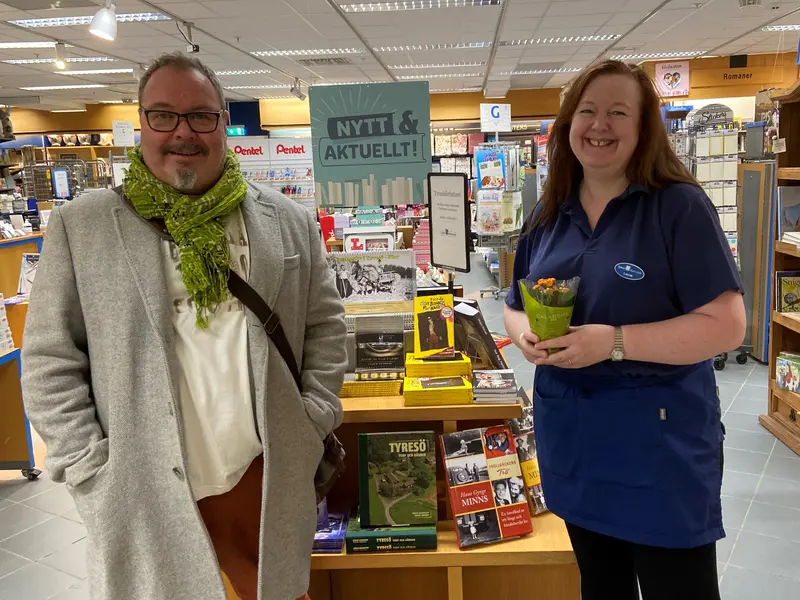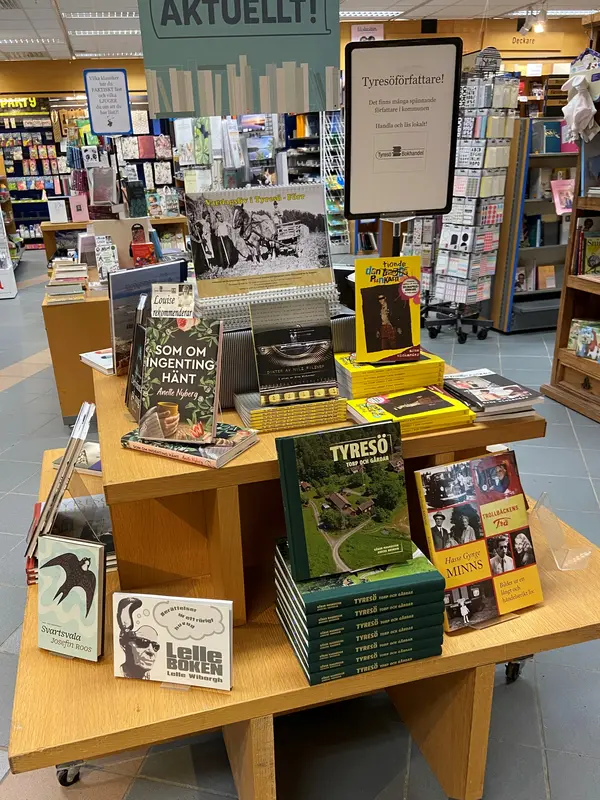 Direkt när man kommer in i Tyresö bokhandel så ser man de Tyresö-böcker som just nu är mycket populära.