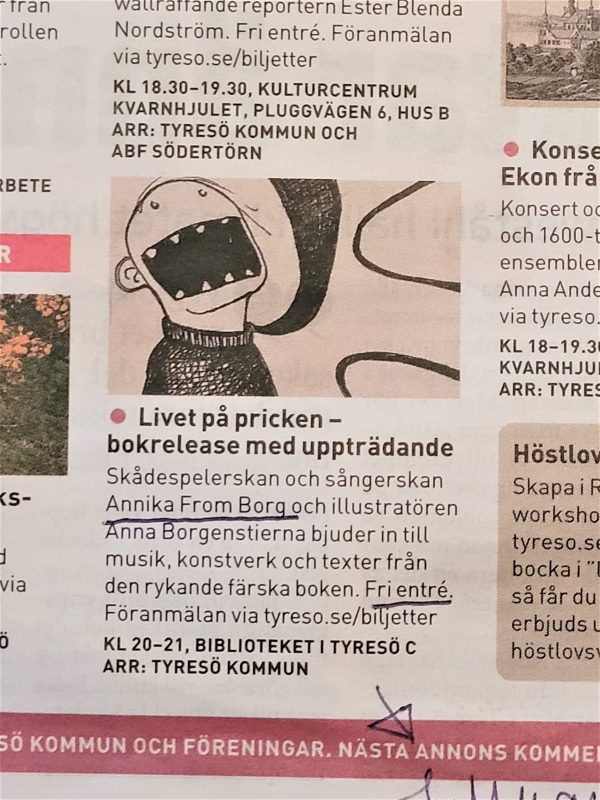 Ja, precis så är det, säger författaren Annika From Borg. Här finns det igenkänning vare sig du är kreatör, flanör, eller i valfri valör. Boken bjuder in till ett litet universum i ord och bild. Orden flödar likt en jätteälv eller kanske mer som en liten bäck. Bokrelease på Tyresö Bibliotek i Tyresö centrum 19 november kl 20-21 med musik, konstverk och texter från boken. Njut av livet! Förverkliga dina drömmar! hälsar Annika. Programmakare Gunnel Agrell Lundgren