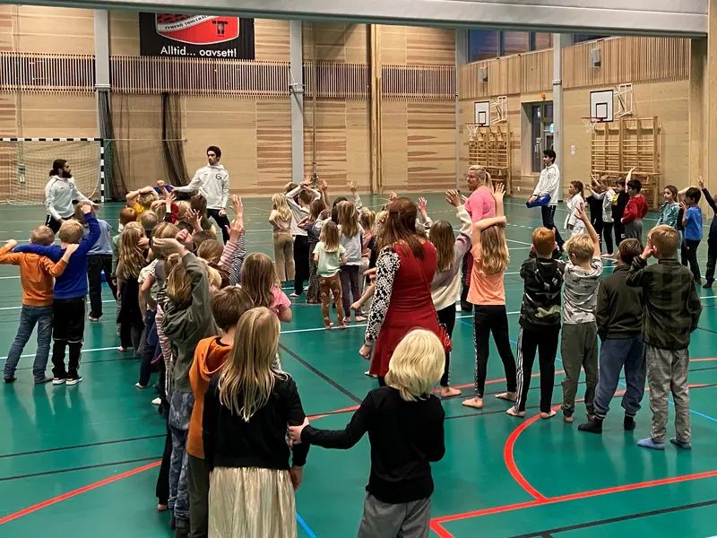 Barnen på Fornudden ställer upp sig i rad och tränar olika moment