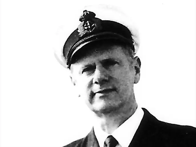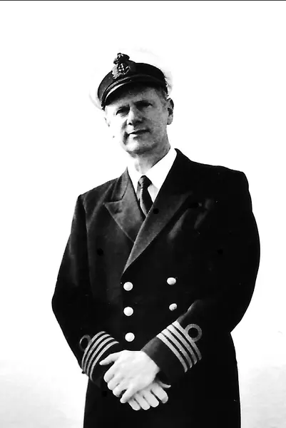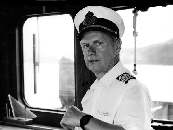 Kapten Carl Gustav Fransén i styrhytten på HMS Carlskrona. Kolla den skarpa blicken . De fyra strecken på axelklaffen visar att han är befälhavare ombord.