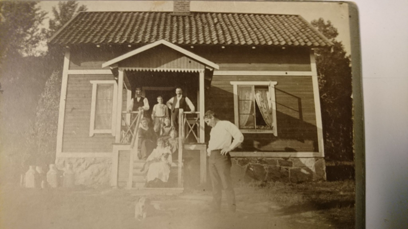 Samma Skogsäng. Här har Carlsonklanen ställt upp sig som torp/gårdsägare 1911. På trappan Bernhard, Amanda ,Gunnar, Svea , "far" Carl Henrik och han som sitter framför är Elis.