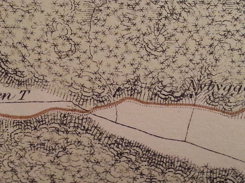 Detalj ur 1750 års kartan där tecken för Såg är inritad på platsen vid Trollbäcken /Sågbacken idag Lindalsvägen. Sågen var en Skvaltsåg som drevs av en typ av turbin /propeller . Nästa vattendrag hette Näsby ström. Längs dalgången går Stordiket som mynnade ut i Drevviken vid Ringströms.