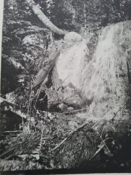 Här stod Gunnar Carlssons ladugård med bostadshuset mot bergskanten. Det är brodern Elis som står vid dammen där Bernts far Åke höll på att drunkna