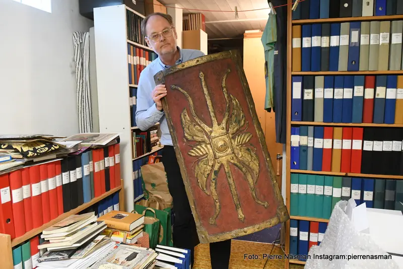 Clas hade fler intressen och visar här glatt upp en sköld som användes i filmen "Cleopatra" med Elizabeth Taylor i huvudrollen från 1963. Det var supercoolt och en rejäl bonus utöver UFO samtalet.