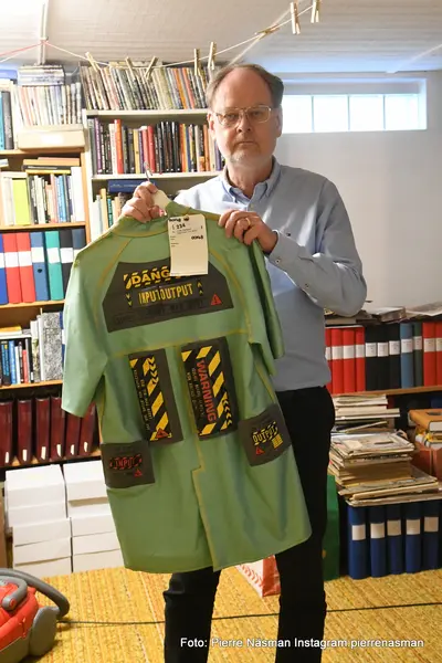Clas håller upp en orginal jacka som användes i filmen "The Fifth Elemente" från 1997 där stjärnorna är Bruce Willis, Milla Jovovich och Gary Oldman.