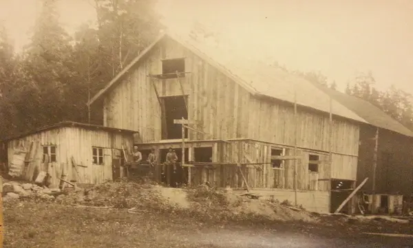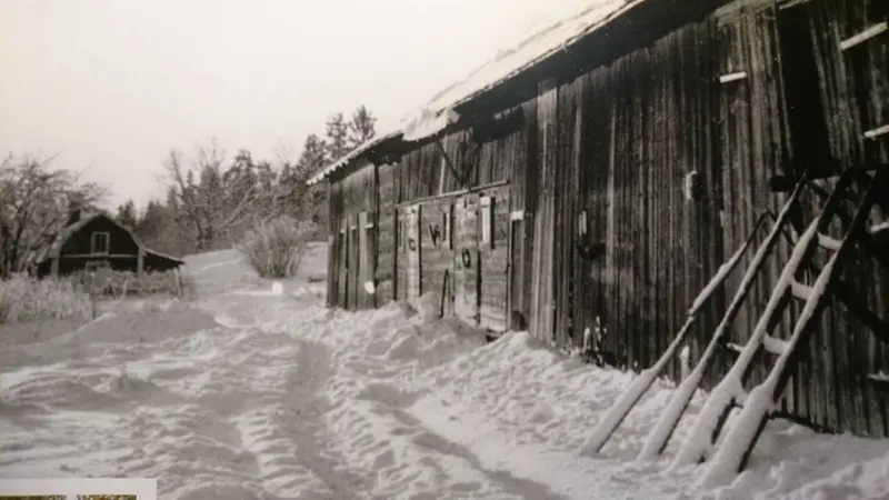 Bernt Karlssons farbror Bernhards Ladugård. Det första bygget som bröderna Karlsson gjorde på Skogsäng 1918. Den rymde 10 kor och 2 hästar i ladugården plus loge och höskulle. Det var körbro upp på skullen från slänten baktill. 1955 var det bilverkstad i ladugårdsdelen och ca 15 vinterförvarade bilar på logen och skullen och då tog det eld i byggnaden och allt totalförstördes.