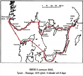 Här ser man rutten sommaren år 2000. Den sydliga delen mot Stavanger gick runt Skåne genom Limfjorden i Danmark och rätt över havet till Stavanger. Återresan gick runt Norges sydspets, utefter Bohuslän, Göta Älv, Göta kanal och kusten norrut via Trosa och hem till Rafikis hemmahamn vid Tyresö Båtklubb. 1675 sjömil. 2 månader och 8 dagar.