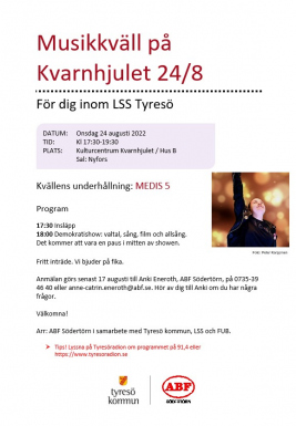Anki Eneroth och Eva Lundgren talar om ABF:s Musikkväll för LSS-medlemmar i Tyresö den 24 augusti kl 18 i Kvarnhjulet sal Nyfors. Det blir fika, dans film m.m. och så dans såklart. Anmälan till ABF senast den 17 augusti. Och så är det gratis. Anki talar också om ABFs folkbildningsuppdrag och samverkan med övriga studieförbund. Programmakare Gunnel Agrell Lundgren