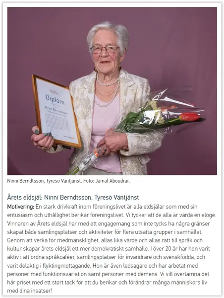 Ninni Berndtson blev Årets eldsjäl 2018 i Tyresö. (Se nedan) Nu vid 90 års ålder är hon fortfarande fullt upptagen med att hjälpa sina medmänniskor. Hon har i 30 år varit engagerad i Tyresö Väntjänst och numera har hon även gått in i styrelsen i SeniorNet. Hon har varit aktiv i att ordna språkcaféer, samlingsplatser, vandringar för äldre och mycket mer. Intervjuar gör Ann Sandin-Lindgren.