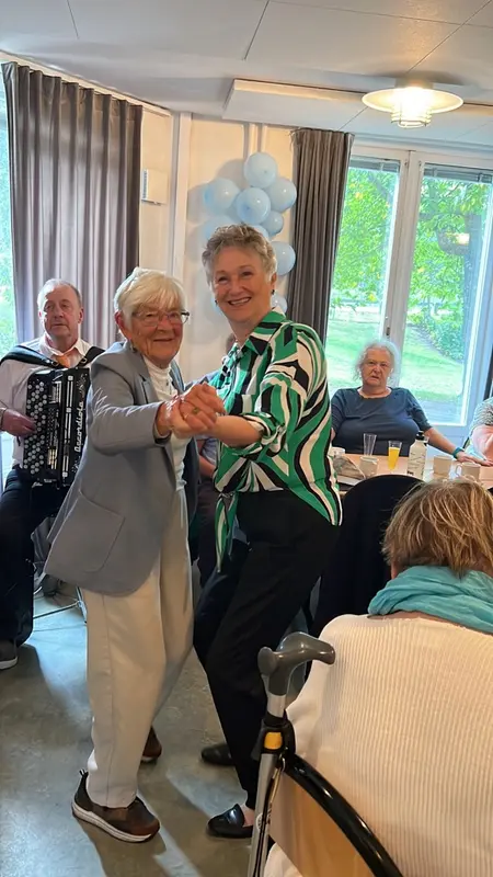 Eldsjälen och sekreteraren Ninni Berntsson och ordförande Kerstin Malmgren dansar till Gunnar Olofssons dragspelsmusik.