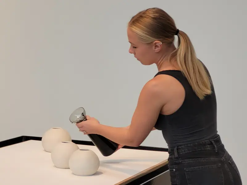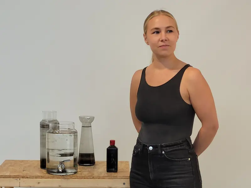 Konstnären Malin Ida Eriksson bredvid sina vätskor