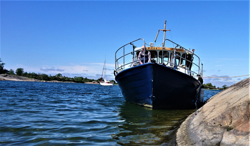 Svea förtöjd med flera linor med sidan mot en bergvägg och med landgången utlagd. Foto Bernt Karlsson.
