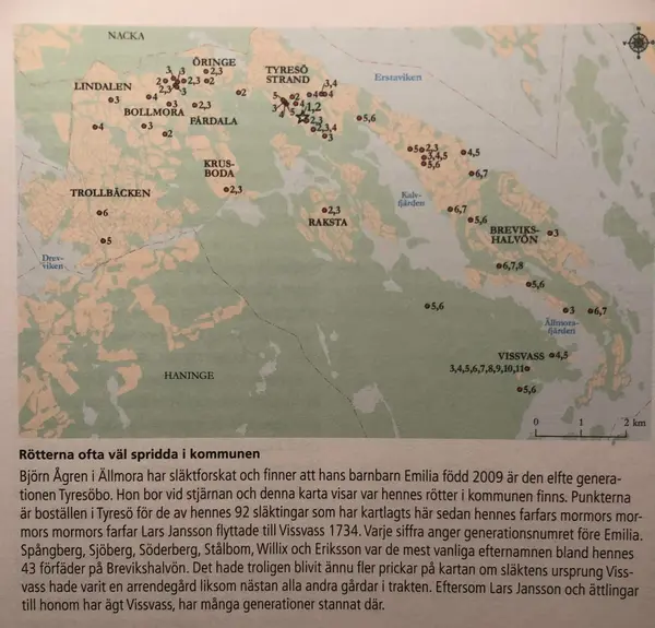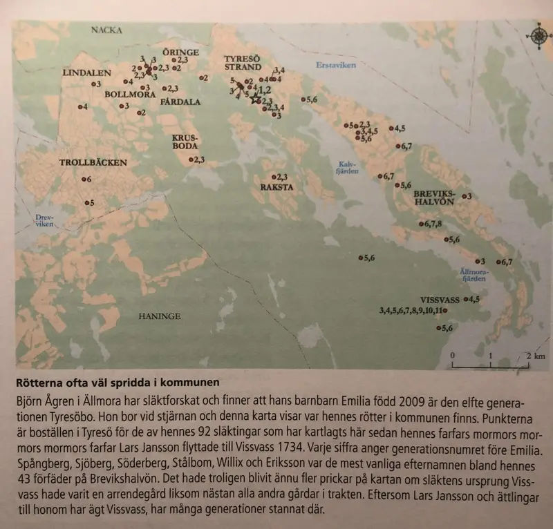 En sida i boken "Brevikshalvön - I skuggan av en markis" där Björn har släktforskat och funnit att hans barnbarn Emilias farfars mormors mormors mormors farfar Lars Jansson flyttade till Vissvass 1734.