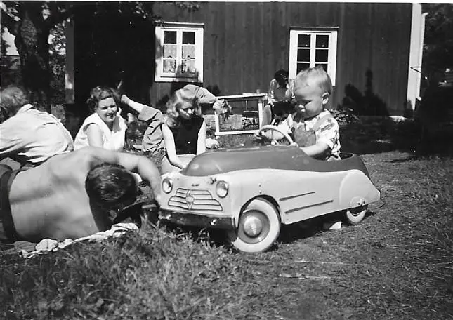 Björn i sin trampbil (bilintresse redan då) framför "Gammelhuset" i Vissvass. Hans morfar, skogvaktaren på Tyresögodset, Nils August Eriksson försöker värja sig ifrån att bli överkörd. Hans fru Björns mormor Ester Eriksson (född Spångberg) tittar roat på sin man.