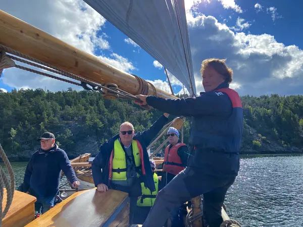 Björn Ågren på den tvåmastade skonaren Ellen som båtentusiasten Bernt Karlsson tagit med bl.a. Tyresöradion på.