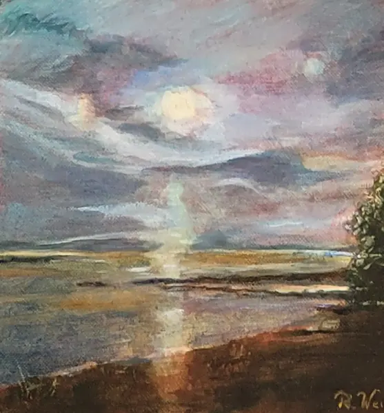 Molnängeln som jag köpte på Ragnhilds utställning på Galleri Eva i Stadsparken Tyresö sommaren 2022. Här har hon använt sig av akademiskt skiktmåleri i 17 skikt. Motivet är från Stockholms norra skärgård.