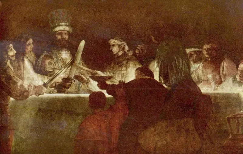 Här är Ragnhilds kopia av Rembrandts målning Batavernas sammansvärjning. Akademiskt skiktmåleri. Jättestor målning.