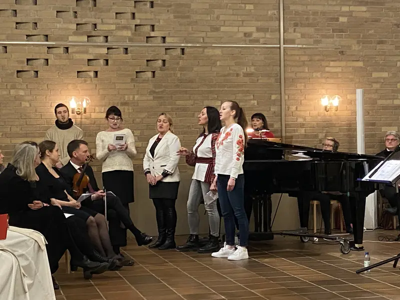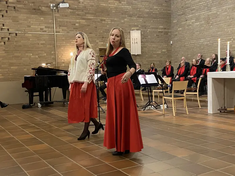 Lena och Julia framför en traditionell ukrainsk sång under musikgudstjänsten i Bollmoradalens kyrka.