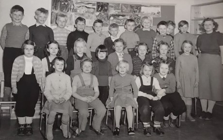 Gunilla Mellin i första klass i Gula skolan. Gunilla är minst och yngst och sitter i andra raden med mörkt hår med pannlugg.