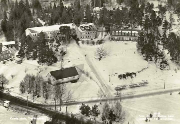 Kumla Skola på 1950-talet "Tegelskolan" byggdes 1949 och huset nere till vänster är Rektor Navins och vaktmästare Lennart Hammar bostäder. Till vänster anas det gamla ålderdomshemmet som byggdes 1926. Det gick två ettor och en andraklass i träskolan uppe till höger. Sedan blev det en hopslagen klass av respektive årsgrupp upp till åttan i Tegelskolan till vänster i bild.