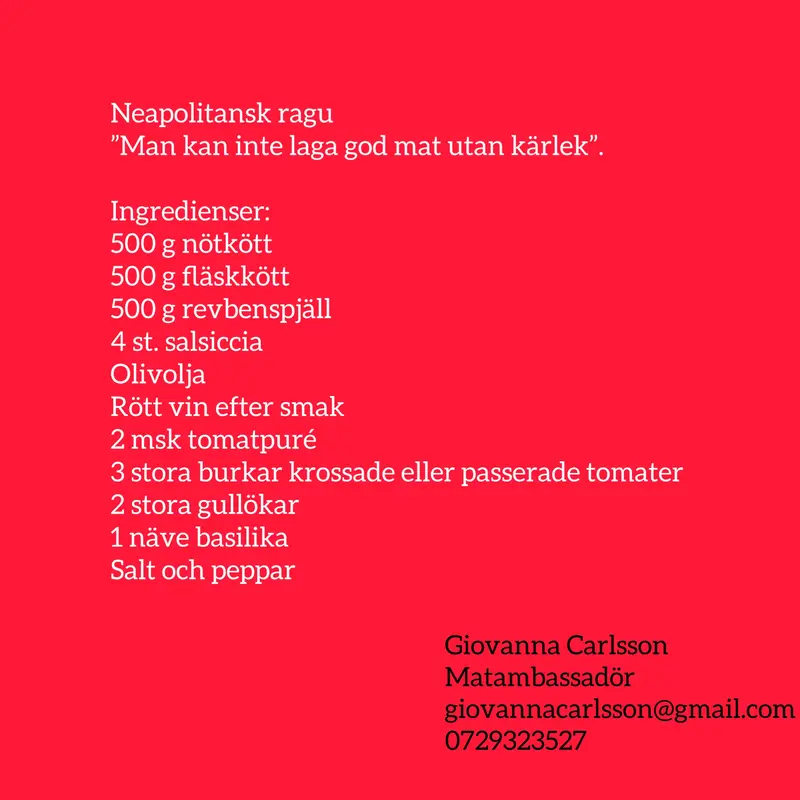 I denna nya serie får vi följa med på en matresa genom Italiens olika regioner med Giovanna Carlsson. Hon är en Tyresöbo med stort kunnande och engagemang kring det italienska köket. I detta första program besöker vi Neapel och Campanien. Och Catarina Johansson Nyman som är programmakare får förstås provsmaka på Giovannas goda ragu och gnocchigratäng!