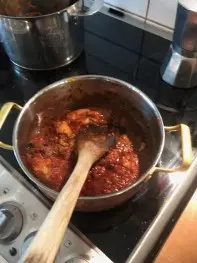 - Tillsätt tomatpurén och låt den smälta. Tillsätt därefter krossade eller passerade tomater. Höj värmen och späd med lite vatten. Så snart det börjar koka sätter du plattan på lägsta värme och låter såsen sjuda.