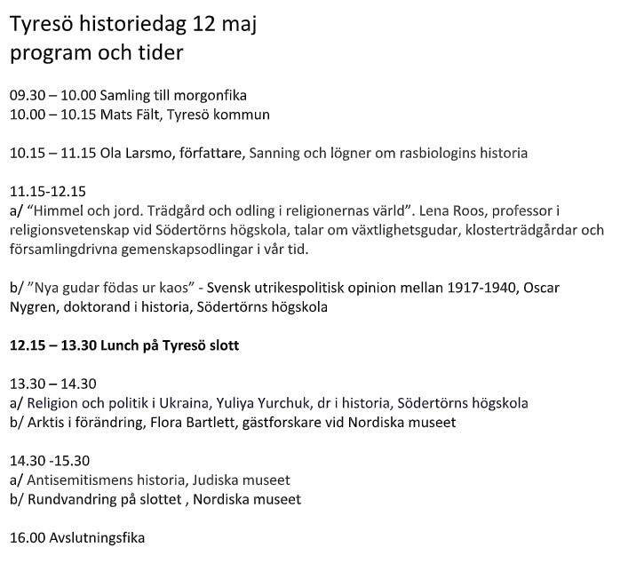 Återigen dags för Tyresö Historiedag på Tyresö Slott! Håkan Blomqvist, docent på Södertörns Högskola och Mats Fält(M), Tyresö kommun berättar om det digra och intressanta programmet. Evenemanget går av stapeln fredag 12 maj och kommer bl a att gästas av författaren Ola Larsmo som pratar om rasbiologins historia. Andra teman under dagen är bl a Ukraina, Arktis och antisemitismens historia. Catarina Johansson Nyman är programmakare.