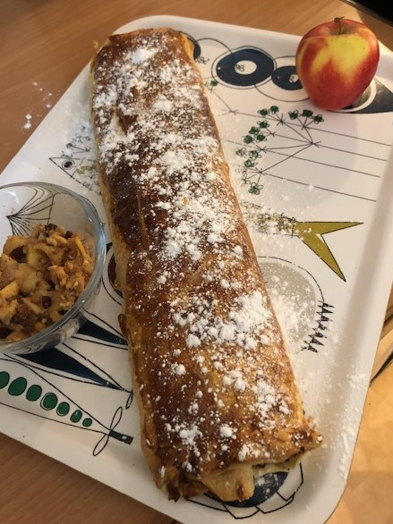 Sätt ugnen på 200°. Skala och tärna äpplena. Grovhacka nötterna och blanda dem med socker, russin och kanel. Rulla ut degen på plåt med bakplåtspapper. Bred fyllningen på ⅔ av smördegen och rulla ihop. Pensla med uppvispat ägg. Grädda i mitten av ugnen ca 20 min på 180 grader Låt svalna på plåten. Pudra över florsocker.