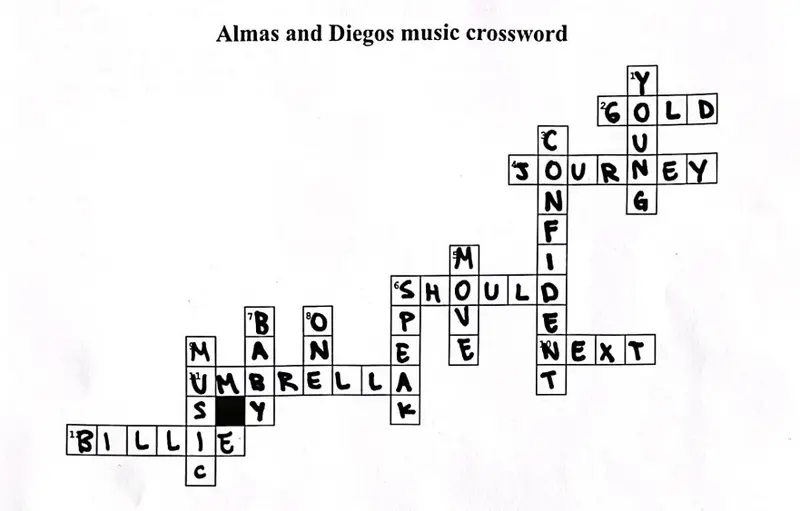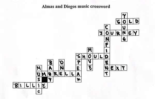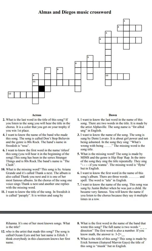 Diego Warginger och Alma Pensola, elever i klass 5a Nyboda skola, bjuder in till ett musikkryss på engelska. Du hittar ett tomt kryss här på hemsidan om du vill delta. Du hittar även ett facit. Good luck!