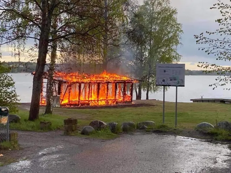 Omklädningshytten på Stenbadet/Kumlabadet brinner
