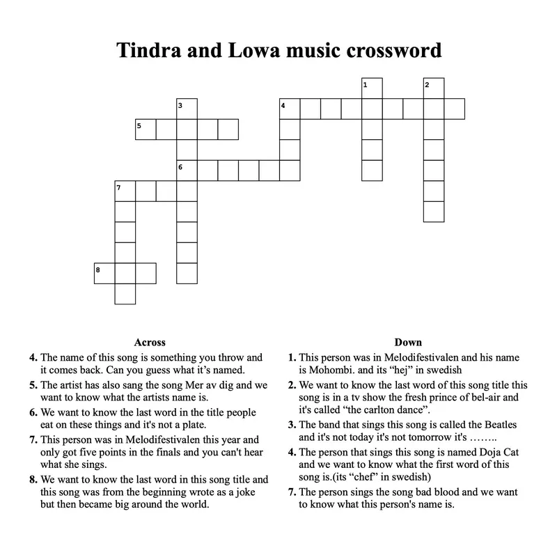 Lowa Modig och Tindra Söderberg i klass 5a, Nyboda skola, bjuder in till ett musikkryss på engelska. Korsordet finns här om du vill fylla i. De rätta svaren kommer i slutet av programmet. Good luck!