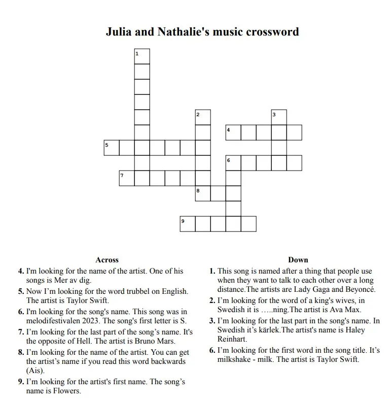 Julia Swenman och Naomi Brozin-Magnell i klass 5a på Nyboda skola bjuder in till musikryss på engelska. Korsordet finns här för den som vill delta. De rätta svaren kommer i slutet av programmet.