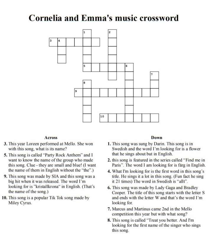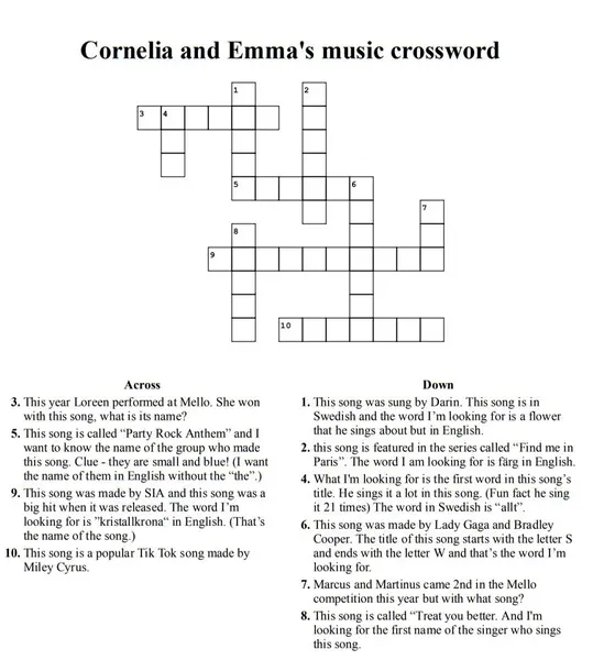 Cornelia Baker och Emma Wiregård i klass 5a på Nyboda skola bjuder in till musikryss på engelska. Korsordet finns här för den som vill delta. De rätta svaren kommer i slutet av programmet.