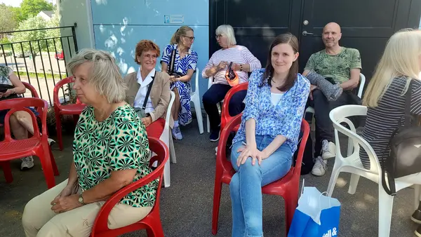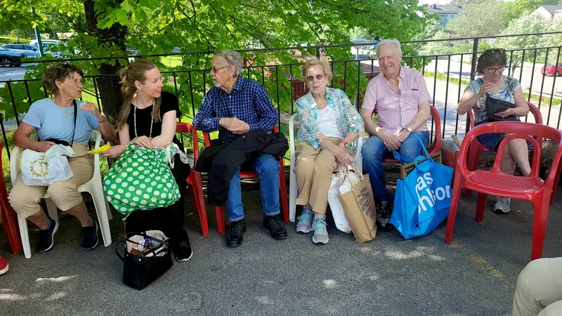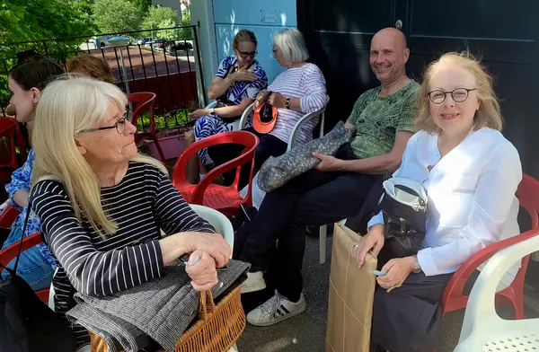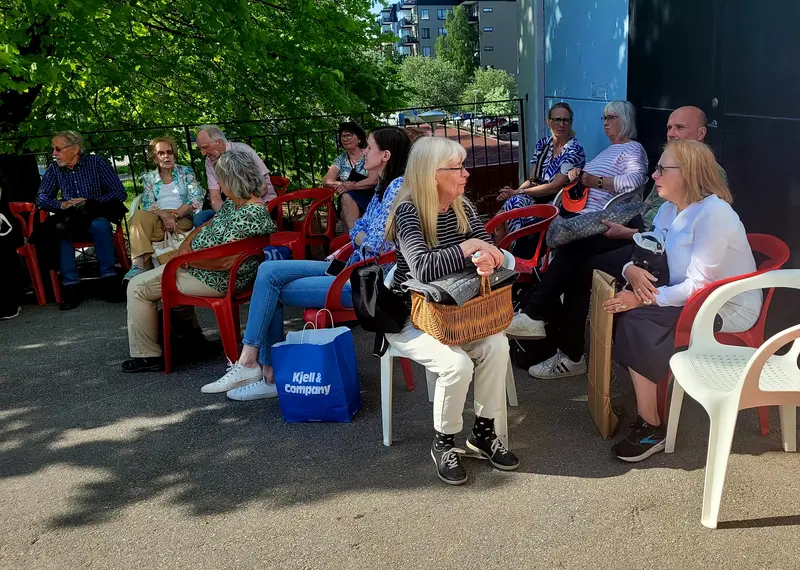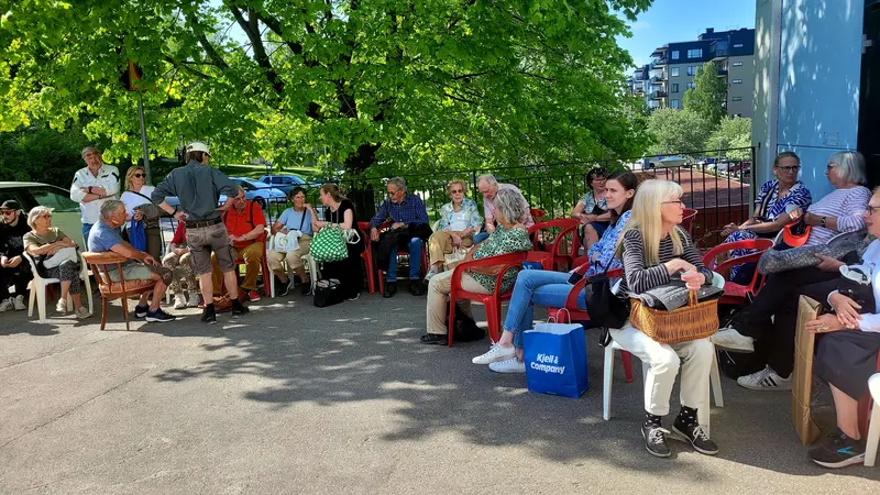 Köande besökare är vid gott mod. Skönt att sitta i skuggan.
