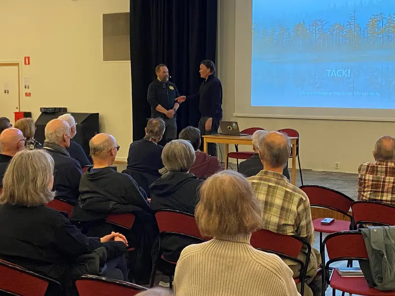 Lyssna på ett mycket intressant föredrag av nationalparkschefen Jonas Ekstrand som berättar om Tyresta nationalpark som funnits i 30 år, dess framtid och utmaningar. Om branden 1999, besökarna, aktiviteterna, Naturummet, djurlivet och växligheten. Ett föredrag med ca 40 deltagare som arrangerades den 19 april av Tyresö Hembygdsförening.