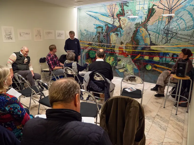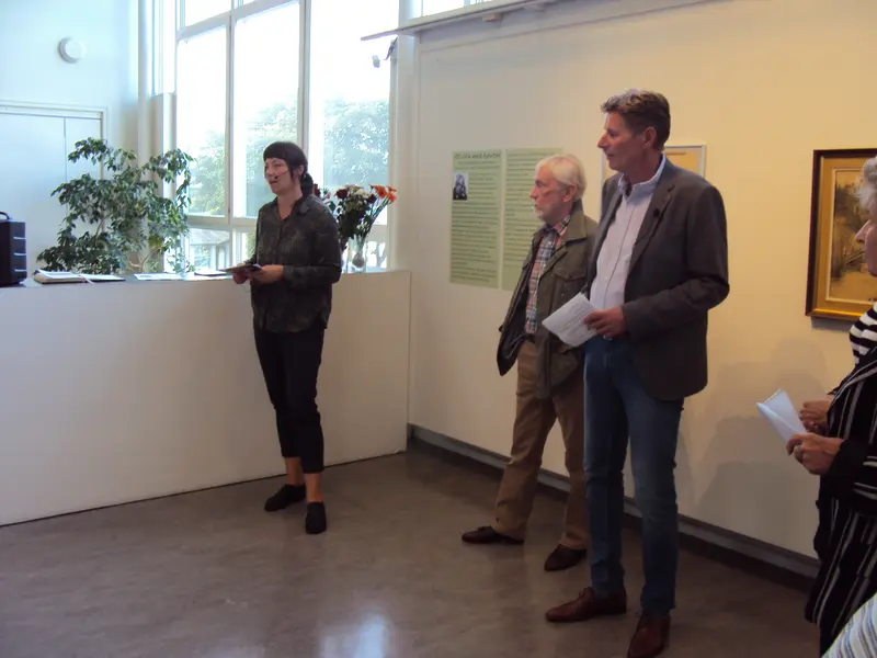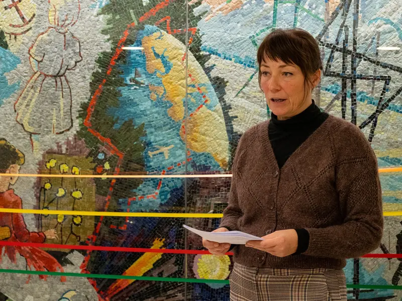 Charlotte Gyllner håller tal till de som jobbat med att rädda mosaiken och om Björn Jonssons verk i Tyresö.