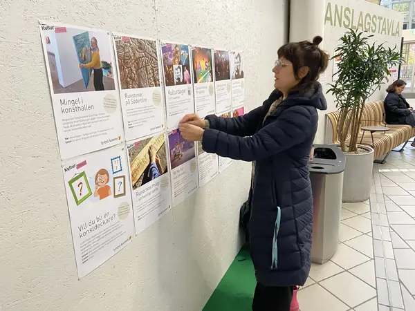 Ella Rudfeldt sätter upp affischer på anslagstavlan/väggen vid Pressbyrån i Tyresö Centrum.