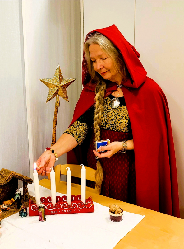 Sagoberätterskan Marina Granlund sjunger och berättar om Advent. I Pilgrimscentrum mittemot Prinsvillan lockar hon med att den första advent är det en liten julmarknad där med lotter och gotter. Och fika förstås. Barnen får klappa levande får och se ett Adventsspel på 20 min. Hon berättar också om varför vi tänder ljus, slaktar grisen och hänger upp stjärnor i fönstren. Programmakare Gunnel Agrell Lundgren