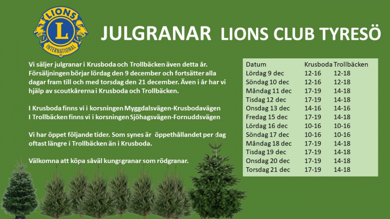 Lions Tyresö säljer julgranar i Krusboda och Trollbäcken även detta år. Försäljningen börjar lördag den 9 december och fortsätter alla dagar fram till och med torsdag den 21 december. Även i år har de hjälp av scoutkårerna i Krusboda och Trollbäcken.