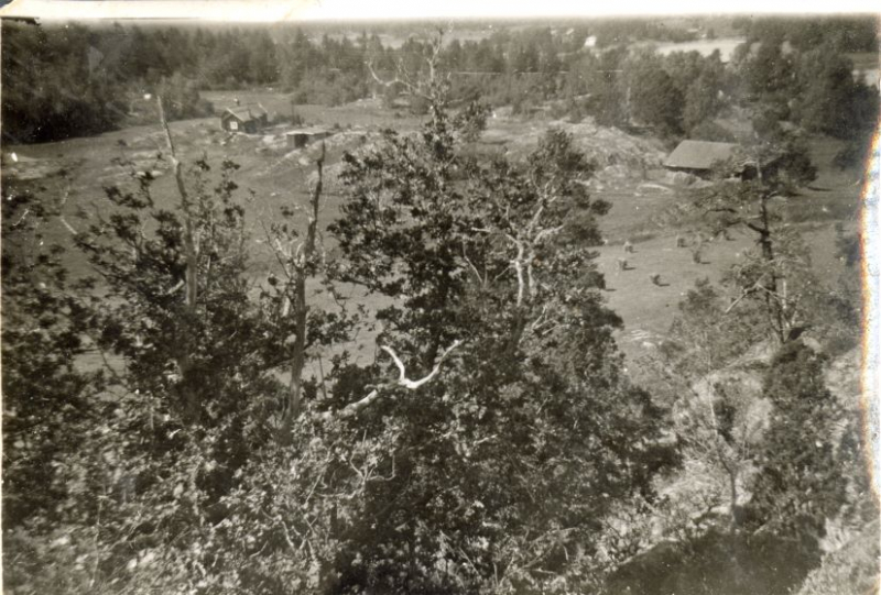 Tyresö gård i bakgrunden. Karolinahemmet längst ner till vänster och dess uthuslänga till höger. Fotot taget från kyrktaket. Bild är sannolikt tagen 1941.