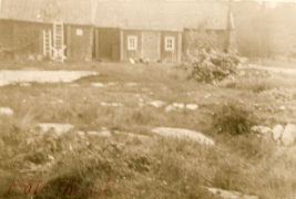 Husen i Raksta. I huset till vänster bodde familjen Lind och i det högra bodde Johan August Jonsson.