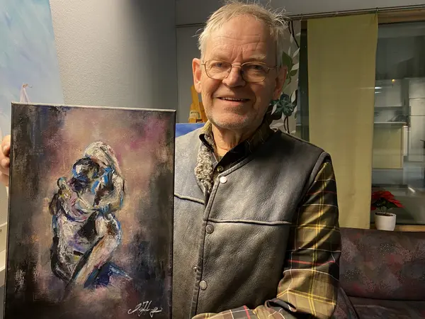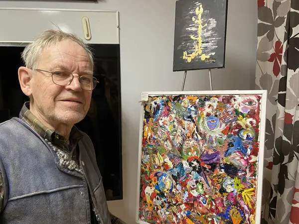 Eero visar upp konst han har köpt av Penseldraget som håller till i hans lokaler.