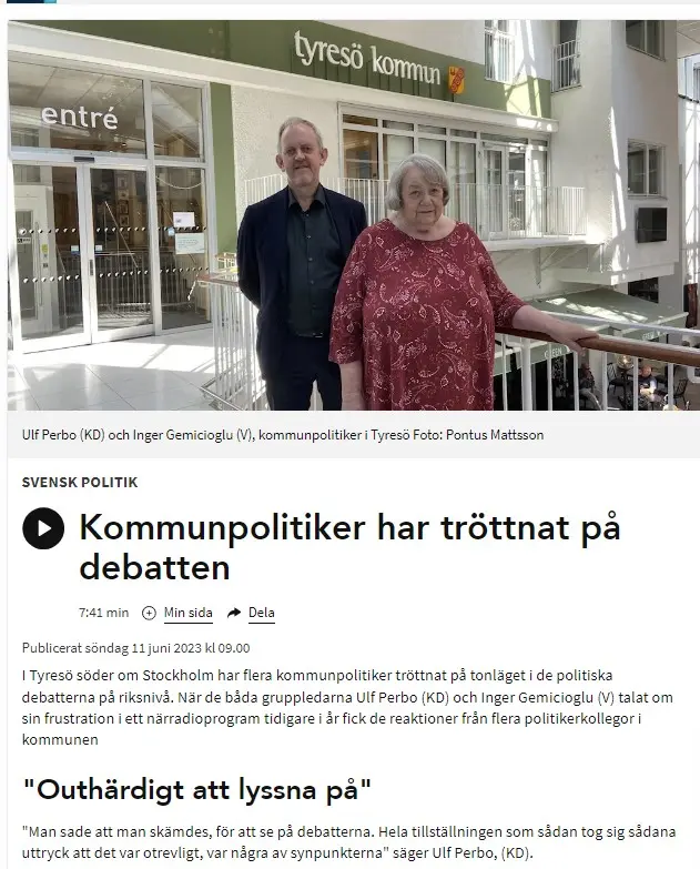 Kommunalrådet Anita Mattsson (S) och Ulf Perbo (KD) diskuterar med Ann Sandin-Lindgren om hur stämningen är bland lokalpolitikerna i Tyresö. Förra året uppmärksammade Sveriges Radio ett program på Tyresöradion där Inger Gemicioglu och Ulf Perbo tyckte att debattnivån på riksplanet är pinsamt låg. Är den bättre i Tyresö? Hur mycket skratt är det i kommunfullmäktige?