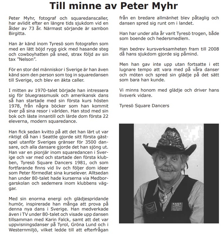 En arkivpärla från 2003 där Åke Sandin intervjuar fotografen Peter Myhr (1939-2013) som tidigare hade tagit squaredancen till Sverige på 70-talet. I intervjun får vi höra musik av Peter. Med i programmet är även Inger Karlsson och de berättar tillsammans om Tyresö Square Dancers aktiviteter och kurser.