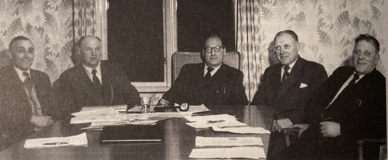 De kallades i folkmun "de fem stora" på 50-talet. Det var från vänster Ivar Lundell (FP), Ture Åkerblom (FP), J K T Wisén (S), Gunnar Gyllnert (S) och Alfs far Håkan Hasselgren (S).