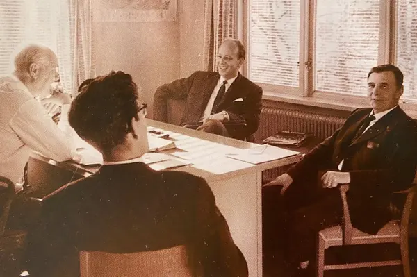 Hörnrummet i kommunalhuset i Trollbäcken. Till vänster sitter kommunalrådet Gunnar Gyllnert med kommunalkamrer Gunnar Tunevi bredvid och förhandlar med markägaren Simon Berg till höger. Från boken "FRÅN VILDMARKSSTRÅK TILL STORSTADSSATELLIT" av Anne Sahlin