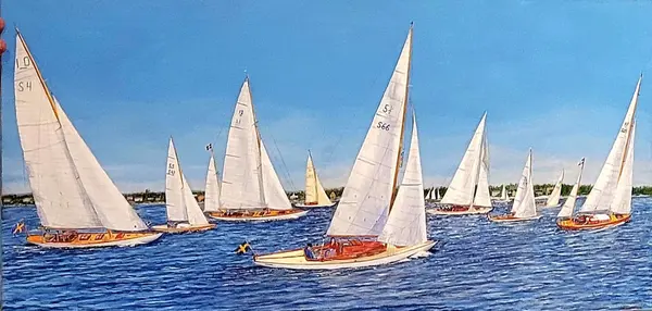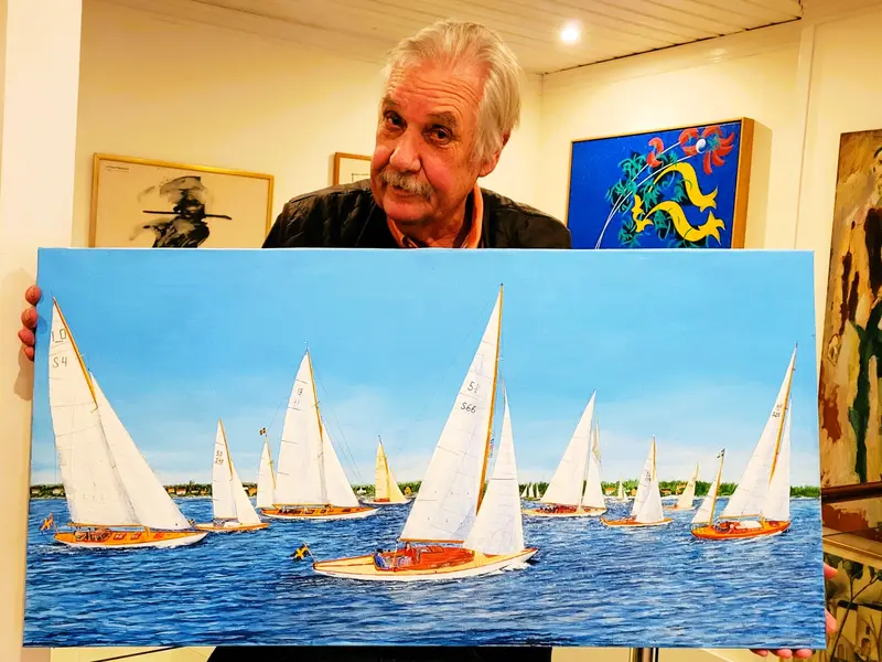 Vi tittar på oljemålningen med alla båtarna medan Åke Cyrus fortsätter berätta om dem. En underhållen träbåt kan leva i minst 100 år säger Åke. Programmakare Gunnel Agrell Lundgren