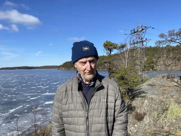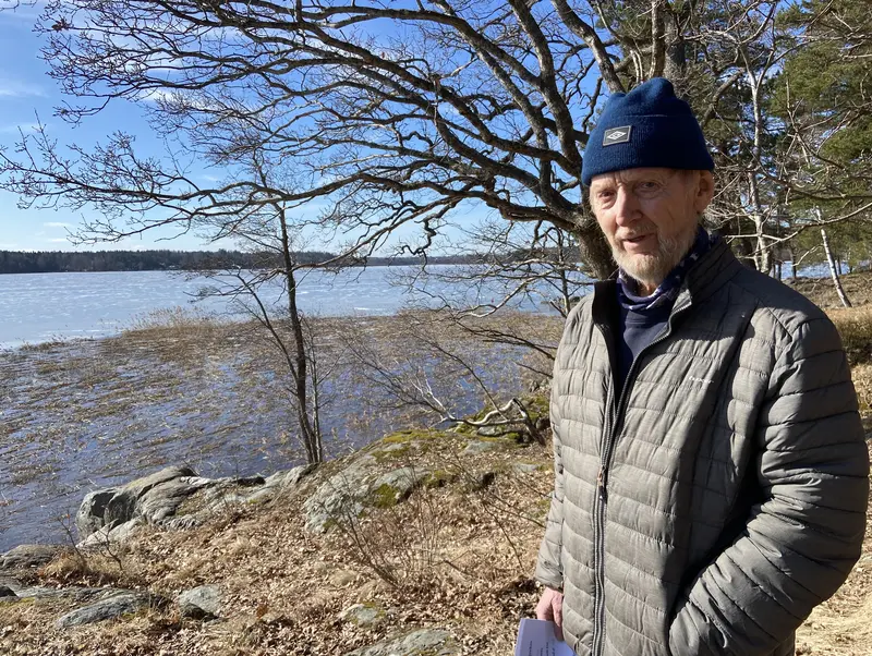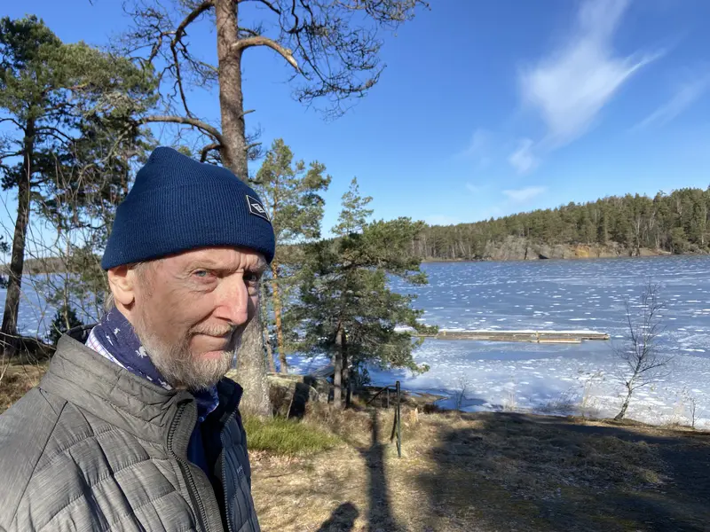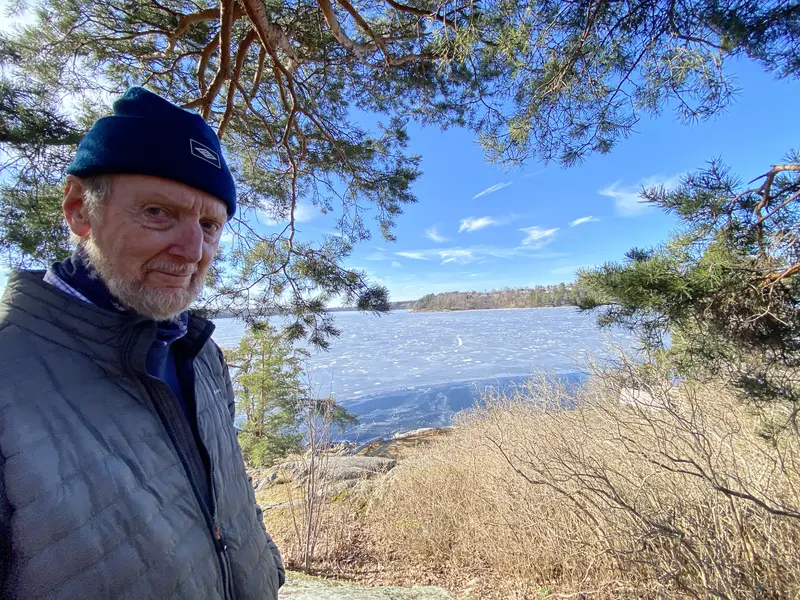 Bernt vid Hästhagsbadet med båtbryggorna i bakgrunden på udden.