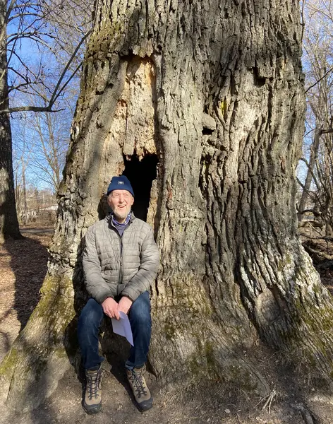 Bernt njuter i solen vid den stora eken i Fornuddsparken.